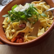 Tagliatelle ist eine Eiernudel, die typisch für Emilia und die Romagna ist und in der traditionellen Küche des Zentrums verbreitetund Norditalien. Ihr Name leitet sich vom Verb „schneiden“ ab, da sie traditionell durch Ausrollen des Teigs in dünne Blätterteig und Schneiden nach dem Aufrollen erhalten werden