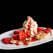Waffeln mit Erdbeeersosse8,80 €Frische selbstgemachte Waffeln, Sahne, Cremiges italienisches Vanilleeis, Erdbeersosse